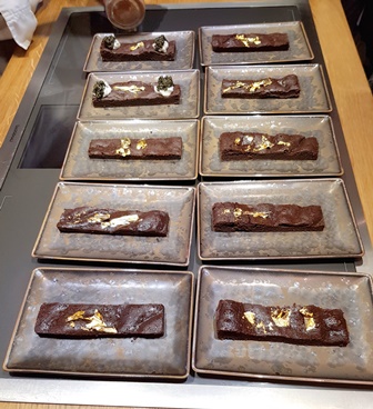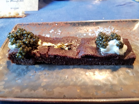 Nous nous levons de table pour aller contempler Valérie distillant les grains de caviar sur un gâteau au chocolat. L’exercice est particulièrement osé, et Valérie le réussit brillamment. Qui pourrait dire que chocolat et caviar cohabitent ? On sent clairement le sel du caviar et la douceur du chocolat mais ce qui nous subjugue c’est qu’aucune composante du plat ne nuit à aucune autre. On dirait de Valérie qu’elle est audacieuse. Elle l’est et elle a réussi.