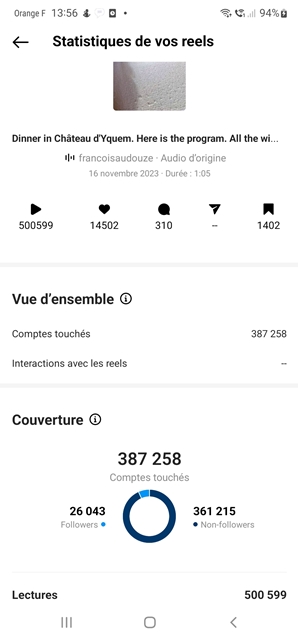 Sur Instagram, la vidéo que j’ai publiée des vins du dîner au château d’Yquem du 16 novembre 2023 vient d’atteindre 500.000 vues.