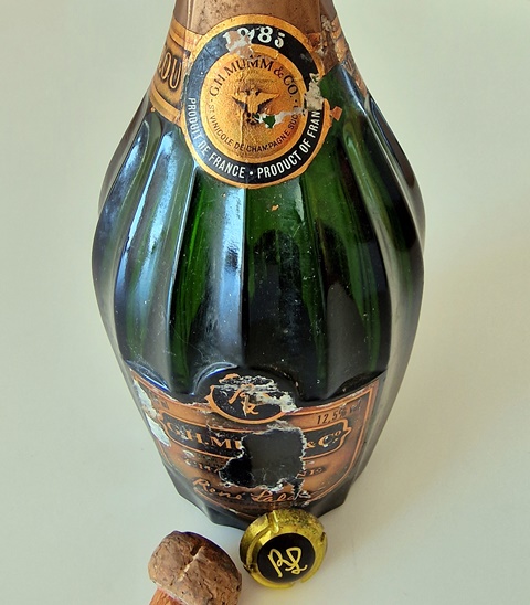 J’ouvre un Champagne Dom Pérignon 1975 dont le bouchon me semble plus fatigué qu’il ne le devrait et vient trop facilement. La couleur est très ambrée, la bulle est inexistante mais le pétillant est présent. Ce champagne fait plus vieux que son âge et a dû subir des stockages aux températures excessives.
