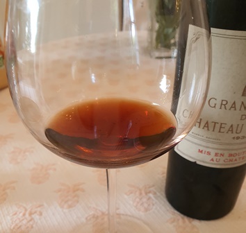 A 16 heures j’ouvre la bouteille. Le bouchon est d’un liège d’excellente qualité qui cependant n’a pas empêché l’évaporation. Le nez est discret mais me laisse penser que le vin peut revivre. Quelques minutes plus tard, je sens une légère impression de torréfaction. C’est discret mais je redoute cette odeur.
