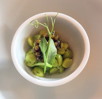 Sylvain, le sympathique sommelier du lieu nous suggère un Cornas Les Ruchets Jean-Luc Colombo 2001 que je trouve délicat, précis et fort élégant. L’amuse-bouche où du caviar voisine avec des petits pois est d’un raffinement extrême. Le petit pois est totalement sublimé par le talent incroyable de Guy Savoy.
