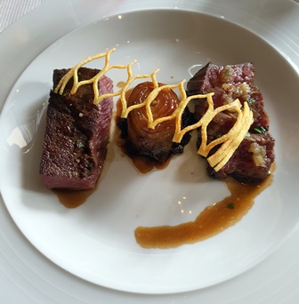 Le paleron maturé et basse-côte persillée de Wagyu en « bœuf-aubergines » et le saladier est un plat délicieux qui n’a pas le génie inventif du plat à la tomate. J’ai à peine picoré dans le chariot des desserts car mon regard s’est porté sur un clafoutis magique, me rappelant les merveilleux clafoutis d’une de mes grands-mères.