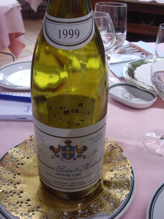 I suggest that we have crab with the Sainte Hune, and I propose an unconventional try, which is to associate a pigeon to white wine. Philippe Bourguignon, the remarkable director of the place smiles and says that it should be interesting, and I take a Bienvenue Batard Montrachet Domaine Leflaive 1999.