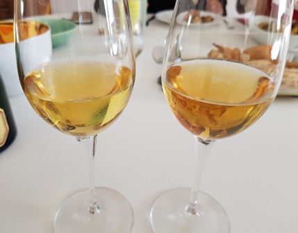 Les bouchons des deux champagnes produisent des pschitt sympathiques, le plus jeune étant le plus bruyant. Les bouchons sont beaux. Versés dans les verres, les ors sont splendides, le plus âgé étant plus foncé. Le nez à l’ouverture est en faveur du Gold, plus expressif.