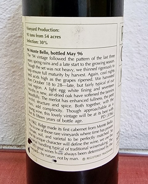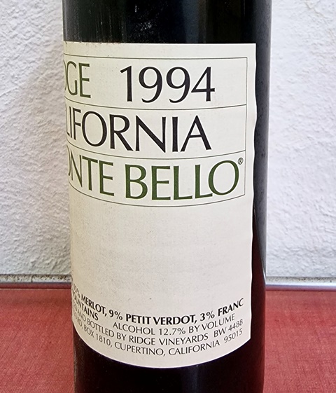 Fort heureusement au moment de servir, l’acidité a disparu et le vin a un joli parfum, riche et conquérant. Je verse le vin. Avec l’agneau du couscous l’accord est parfait. Le vin est plein, riche. Mon frère dit que ce n’est ni un bordeaux ni un Bourgogne et s’oriente vers les vins de Provence. Quand je lui dis qu’il s’agit d’un vin californien, il convient sans hésiter que ses propos récents n’étaient pas adaptés à un vin de cette qualité. Plus le temps passait et plus des notes de garrigues apparaissaient, suggérées aussi par les épices du couscous, ce qui rendait pertinente la piste que mon frère avait avancée. Ce Ridge Monte Bello 1994 est un grand vin américain, peut-être pas le plus complexe, mais franc, joyeux et puissant.
