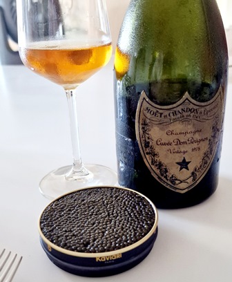 Le caviar osciètre est magique, avec un sel absolument idéal, et on déguste un Dom Pérignon 1978 qui n’a pas souffert du tout. Le champagne est très solide et peut-être parfait malgré tout ce qu’il a souffert.