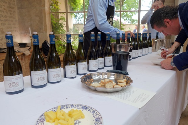 Le lendemain, Louis-Michel Liger-Belair accueille des amateurs, collectionneurs et experts internationaux pour une dégustation exhaustive de tous ses crus pour un nombre important de millésimes récents consécutifs. Le vin le plus représenté offre quatorze millésimes à goûter. Je reconnais beaucoup de célébrités du monde du vin, de tous pays, les Etats-Unis ayant un fort contingent. S’agissant de jeunes vins, c’est un travail de dégustation de professionnel, aussi dois-je le faire ? La curiosité me prend de tout goûter et ce n’est pas une mince affaire car il y a 72 vins !