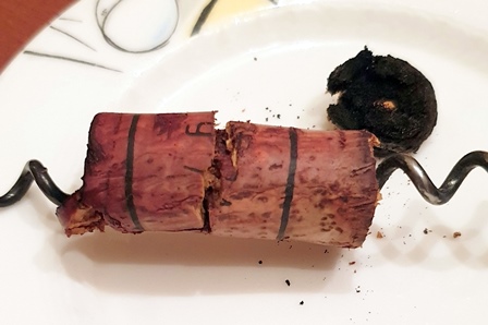 J’essaie d’ouvrir le jéroboam Corton-Charlemagne Caves de La Reine Pédauque 1949 et je ne trouve en haut de goulot que de la poussière de bouchon qui s’émiette. C’est avec le dos d’une cuiller que j’enlève le haut du bouchon ce qui allège la partie que je vais pouvoir extirper au tirebouchon sans que rien ne tombe dans le vin. Je sens le vin et j’ai bon espoir, car aucun défaut n’est perceptible.
