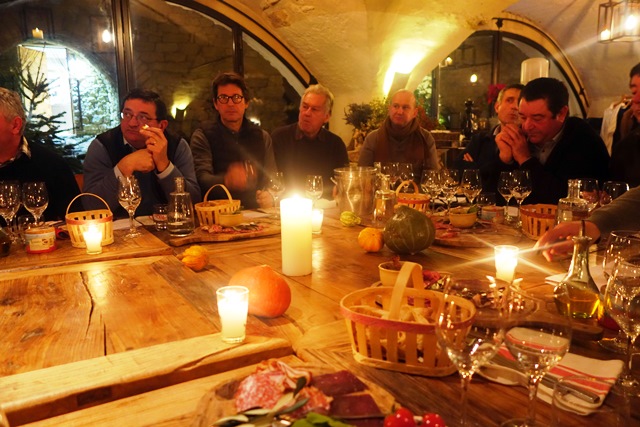 Le rendez-vous est donné à la Bastide de Capelongue à Bonnieux, hôtel Relais & Châteaux tenu par Edouard Loubet qui cuisinera les repas des deux jours. A l’arrivée je me préoccupe d’ouvrir mes vins en attendant que les vignerons et Georges n’apportent les leurs. La salle du restaurant est très longue, voûtée, flanquée de deux cheminées aux deux extrémités de la longueur. Comme il fait très froid des chauffages additionnels surchauffent la pièce aussi je préfère ouvrir mes vins dans ma chambre.