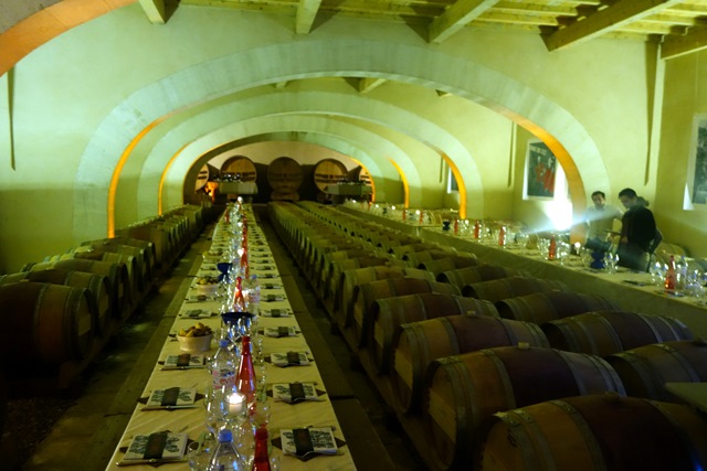 Le déjeuner se tient dans le chai où deux tables interminables permettent à environ deux cents personnes de s’asseoir. Tous les vignerons font goûter leurs vins dans des flacons de grands formats. Les jéroboams et magnums abondent. On passe d’un vin à l’autre tant les vignerons sont heureux de faire goûter leurs vins.