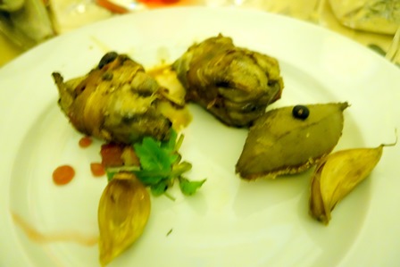 Au dîner nous sommes plus de trente et il n’y a pas loin d’une trentaine de vins encore à boire. Comme nous sommes tous autour de la même table, nous ne boirons pas les mêmes vins et nous ne portons pas autant d’attention aux différents vins qui nous sont servis. De beaux canards ont accompagné des vins de tous horizons comme un joli magnum de Château Talbot 1950, quelques vins espagnols et beaucoup de vins que je n’ai pas notés. J’aurais bien aimé goûter le Bandol domaine d’Ott blanc 1985 à la jolie couleur claire, le Clos Joliette 1979 et le Mouton Baron 1961 mais ces bouteilles ne sont pas venues jusqu’à ma place.