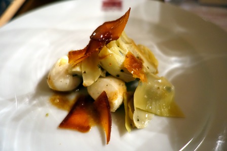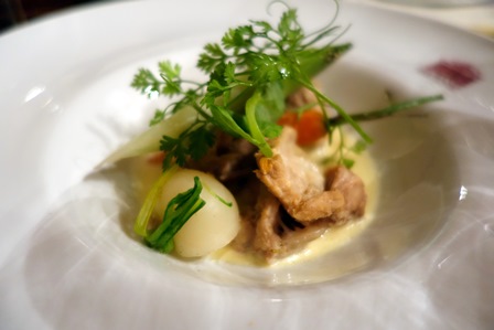 Nous allons boire huit de ses vins sur un menu que j’ai trouvé fort bon mais très osé : mozzarella di Buffala, artichauts confits et lamelles de poutargue / marinière de coques aux beurre de soja / blanquette de veau et petits légumes printaniers / les fromages de Bernard Antony. Menu osé, car les feuilles d’artichaut et la sauce sont rudes, la sauce soja très imprégnante, ce qui a effarouché quelques vins.