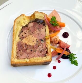 Nous goûtons ensuite le pâté en croûte qui est délicieux et léger grâce aux petits pickles et à la gelée délicate. Le champagne se régale de cet accord. Le ris de veau croustillant avec une déclinaison d’artichauts est un plat massif et imposant qui réclamerait un vin rouge très lourd. Le champagne l’accompagne, mais la valeur ajoutée est plus faible.