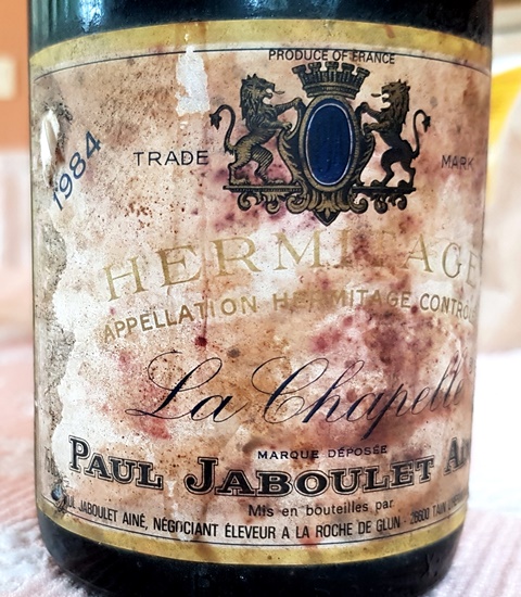 Le boucher chez lequel ma femme a coutume de se fournir offre des morceaux de porcs ibériques élevés comme les Pata Negra que l’on peut cuire comme des steaks. La viande très expressive est accompagnée de petites pommes de terre rissolées. Ce plat est idéal pour l’Hermitage La Chapelle Paul Jaboulet Aîné 1984. Son parfum à l’ouverture, il y a quelque trois heures, m’avait enthousiasmé par sa personnalité et ses accents bourguignons. Il cohabite aussi bien avec la viande qui a une râpe très similaire à la sienne, qu’avec les délicieuses pommes de terre. C’est un vin de caractère, subtil, expressif sans être puissant et s’il est bien rhodanien, il a des amertumes de vin de Bourgogne. Sa justesse de ton est remarquable. J’avais bu il y a peu une Côte Rôtie La Landonne Guigal 1984 que j’avais adorée. L’année 1984, plutôt calme, fait des merveilles à 33 ans.