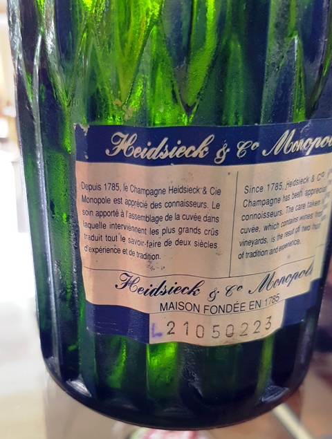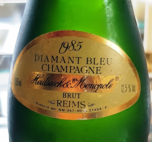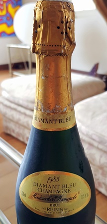 Mes deux filles viennent déjeuner à la maison avec leurs enfants. A l’apéritif nous grignotons de fines tranches de jambon Pata Negra et diverses tartes aux oignons préparées par ma femme et mes petites-filles. Le Champagne Heidsieck & Co Monopole Cuvée Diamant Bleu 1985 a un bouchon qu’il est très difficile d’extirper car il ne tourne dans le goulot que de façon saccadée comme s’il était cranté. Il a fallu que j’utilise un cassenoix pour qu’il se lève entier. Une belle explosion de bulle a salué la sortie du bouchon, le champagne ayant une bulle active comme celle d’un champagne très jeune. La couleur est d’un jaune clair, doré comme un beau blé d’été. Le nez est expressif et en bouche il offre de beaux fruits jaunes. Ma fille cadette parle d’une amertume qui ne me gêne pas et j’aime l’acidité bien contrôlée. C’est un beau champagne plein de vie. Les tartes à l’oignon luis conviennent bien.