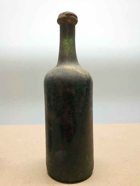 La bouteille est cylindrique, totalement opaque car couverte d’une poussière collée qui a probablement plus de deux siècles. La bouteille est surmontée d’une cire verte que je casse en petits morceaux, car c’est maintenant que j’ouvre ce vin. Le cul de la bouteille est incroyablement profond. Je l’ai mesuré à 7,5 cm. Je suis éberlué de voir que le bouchon est d’une pureté extrême sans aucun signe d’âge alors qu’aucun doute n’est possible, ce vin n’a jamais été rebouché car il fait partie de la collection que j’ai achetée dont tous les vins sont dans leur complet état d’origine. La bouteille soufflée pourrait bien être du 18ème siècle.