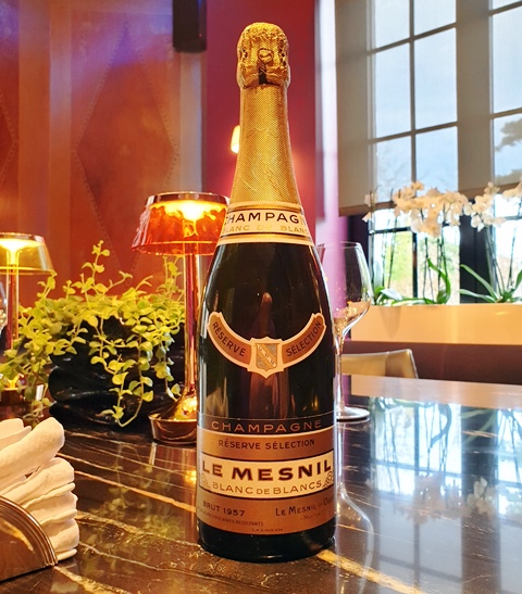 En attendant Richard je bois des mètres cubes d’eau pour estomper les effets du dîner au Relais Louis XIII. Richard arrive et je fais ouvrir le Champagne Le Mesnil Blanc de Blancs Réserve Sélection Union des Propriétaires Récoltants 1957. Je n’ai bu qu’une seule fois un champagne de 1957, un Abel Lepitre. Richard me confirme qu’il n’a jamais bu ce champagne et jamais bu cette année et me dit que fort curieusement il avait déjeuné il y a deux jours avec le président de l’Union des Propriétaires Récoltants. La couleur du champagne est d’un ambre très joli, ensoleillé. C’est sur la fin de la bouteille que l’ambre sera plus sombre. La bulle est absente mais le pétillant est présent. Je suis très content car Richard est un dégustateur positif. Ensemble nous ne voyons que les beaux aspects de ce champagne, car ils existent. Le champagne est chaleureux, ensoleillé et des petites traces de poussière, infimes, ne gênent pas la dégustation.