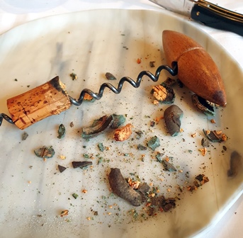 J’arrive au restaurant l’Assiette Champenoise un peu avant 11 heures alors que notre rendez-vous est à 12h30. J’ouvre l’Hermitage Jaboulet 1939 au niveau bas. La bouteille n’a ni capsule ni cire aussi est-ce la première fois de ma vie que je vois un bouchon qui a accueilli un petit ver qui s’est niché dans le bouchon et y a rendu l’âme. L’étiquette du vin est illisible à un point qui ne peut que me surprendre, comme si une limace active et vorace avait voulu tout effacer. La petite étiquette du millésime est parfaitement lisible. Le nom du vin ne peut se lire que sur les autres bouteilles de ce vin que j’ai acquises en même temps. Le bouchon vient sans problème. Il a quand même été goulument mangé par son locataire, ce qui explique en partie la perte de volume. Le nez est beaucoup plus inspirant que ce que l’on pourrait craindre. Nous verrons. Je n’ouvre ni le champagne ni la bouteille antique car je souhaite pour celle-ci que Richard sente le premier nez du vin, celui de l’éclosion.