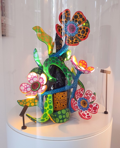 La décoration de l’hôtel du Marc est enthousiasmante, mêlant le classicisme des lieux à un modernisme débridé de bon goût. C’est ce côté extravagant qui a conduit Veuve Clicquot à adopter une étiquette créée par l’artiste japonaise Yayoi Kusama pour son champagne La Grande Dame. L’artiste aux cheveux couleur rouge sang a fait une œuvre magnifique montrée dans le salon de l’hôtel du Marc. J’adore. Et je ne suis pas le seul car notre amie chinoise entre en pamoison devant sa sculpture.