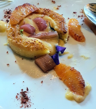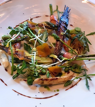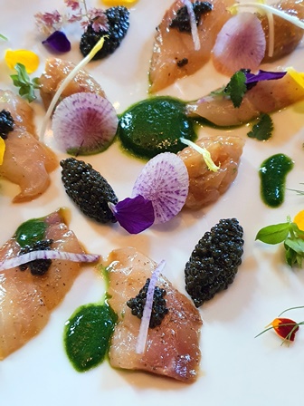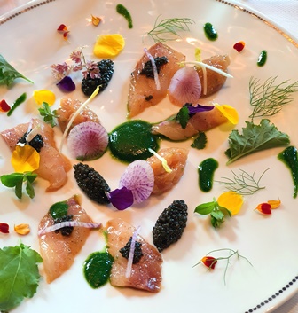 Nous passons ensuite à la belle salle à manger aux murs noir et or. Le menu composé par le chef Christophe Pannetier est : les légumes de printemps, herbes potagères et poutargue / le bar de ligne, sauce ponzu et caviar / les fromages affinés selon Philippe Olivier / la rhubarbe, hibiscus et pain de Gênes.