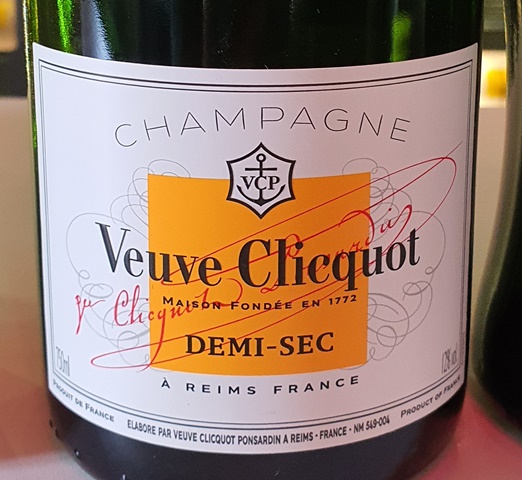 Le Champagne Veuve Clicquot Demi-Sec sans année accompagne le dessert de belle façon. Il est très jeune et très vif. C’est assez déroutant, ces saveurs doucereuses, mais on s’habitue vite.