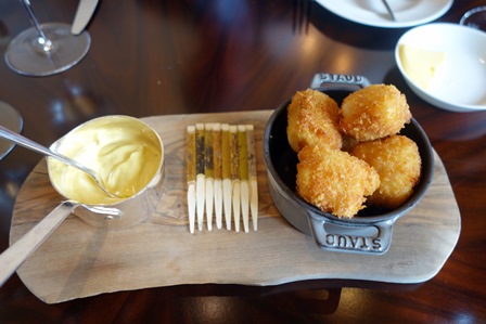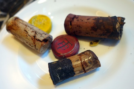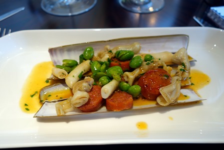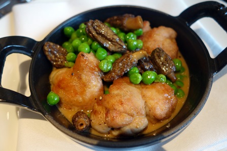 Mes jugements sur la cuisine ne seront pas sur la valeur du talent du chef mais sur l’adéquation aux vins anciens. Les croquettes de lotte sont parfaites pour un apéritif. Les couteaux au chorizo sont à éviter car le chorizo est dominant, propre à étouffer les vins, le homard Thermidor est parfait, le ris de veau aux morilles n’a pas besoin de petits pois. Le porc est goûteux. Lors de l’examen que nous avons fait après le repas, nous avons vu que ce repas préalable était nécessaire pour affiner les présentations, mais que les ajustements seraient faciles à faire. L’envie de coopérer du chef est évidente. Le climat est idéal.