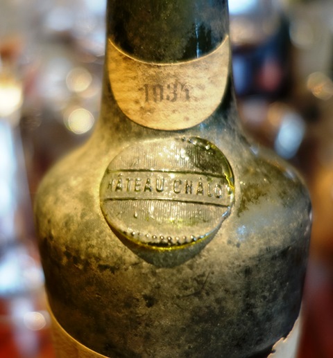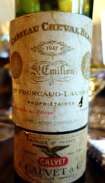 Grant va chercher une bouteille. Je vois qu’il s’agit d’un Château Cheval-Blanc 1947 bouché d’une cape en plastique. Alors que Grant voulait nous la montrer pour que nous jugions si l’étiquette paraît authentique, je croyais qu’il nous proposait de la goûter. Je le remercie donc et il réagit en prince en versant un verre.