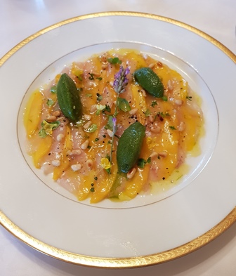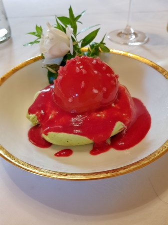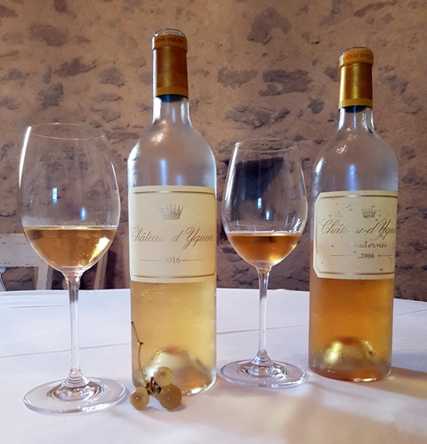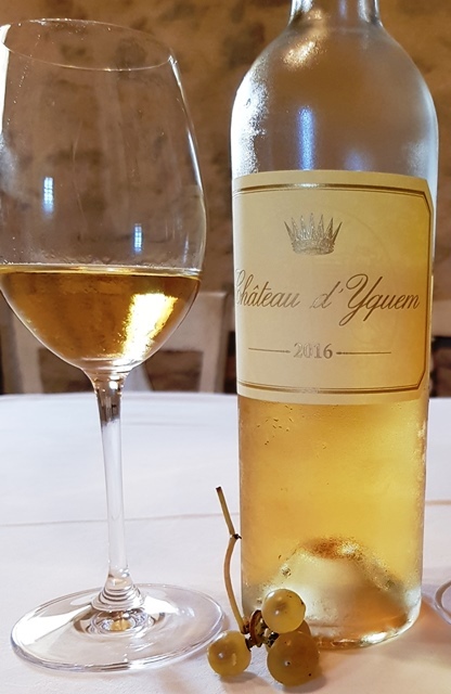 La poularde qui suit est un plat plus cohérent. Mais là aussi une palette plus calme de goûts conviendrait mieux au futur dîner. Mon repas se fait à l’eau mais pour le fromage et le dessert, on m’apporte deux verres d’Yquem, de 2006 et 2016. Le Château d’Yquem 2006 a un botrytis un peu sec mais il a une belle ampleur. Le Château d’Yquem 2016 m’évoque ces mots : « Royal Baby ». C’est l’enfant qui est né avec une cuiller en argent. Il est pur, profond, magnifique à cet âge. Il est dans une phase valorisante alors que le 2006 est dans une phase plus ingrate, un peu refermée. Le 2016 a la concentration typique d’Yquem, mais il n’a pas une des caractéristiques que j’aime, lorsque l’on a l’impression de croquer des grains de raisins.