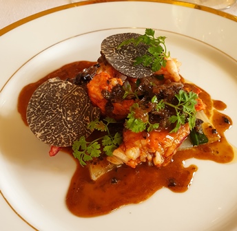 J’ai apporté un Maury des Vignerons de Maury 1929 qui peut accompagner les plats que nous allons tester mais ne servira pas de témoin, car ce sont des vins bien différents qui seront bus sur les plats ce soir. Le premier plat que nous essayons est le homard cuisiné doucement au sautoir avec de jolies écailles de truffes primeur. Le plat est délicieux. Le cerfeuil en fines feuilles rafraîchit bien le plat ainsi que les feuilles de blettes mais il faut enlever le cœur de blette trop abondant et amer et n’en conserver que des timbres postes. Nous buvons un ‘Y’ d’Yquem 2016 très vert et un peu trop sec, qui va s’élargir dans la suite du repas. Le Maury est très adapté au homard et crée un bel accord car ce vin qui titre 16° a beaucoup de fraîcheur. Il a vieilli en demi-muids pendant plus de soixante ans ce qui lui a donné une belle fluidité et une grande délicatesse. Le plat accompagnera deux montrachets, un du domaine de la Romanée Conti et un de Ramonet. Olivier est d’accord de faire un plat moins réduit, plus aérien et moins salé. Nous nous comprenons bien.