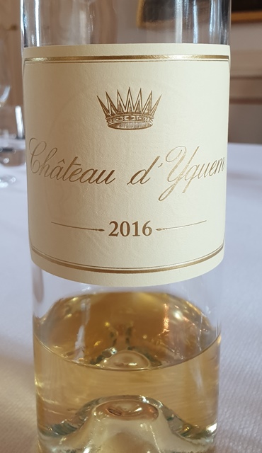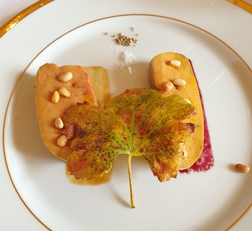 Nous essayons ensuite le foie gras. Dans le menu il est prévu : foie gras de M. Dupérier légèrement fumé puis poché, à la croque-au-sel. L’assiette comporte les foies gras en deux façons, poché et fumé. Il m’apparaît tout de suite qu’il ne faudra pas de fumé, Car le Lafite 1878 ne l’acceptera pas. Il faut aussi enlever les pignons de pin plantés dans les foies. Il se trouve qu’Olivier qui a préparé les foies ne pourra pas mettre deux tranches de poché par personne aussi la solution que nous adoptons est que les foies gras fumés soient servis en deuxième plat pour les bourgognes, après le pigeon, et le foie gras poché sera comme prévu pour le Lafite. Nous buvons le Château d’Yquem 2016, merveilleux dans sa jeunesse folle car il a la candeur et les joues roses d’un bébé. Et cela va bien avec les foies. Le Maury aussi trouve sa place avec le foie non fumé. L’Yquem 2016 sera grand, un Yquem plus frais que puissant.