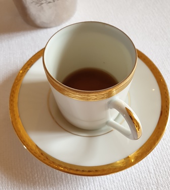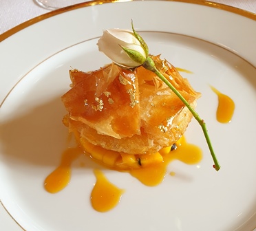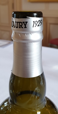 Le dessert est une croustade « 18 Carats » de mangue cueillie bien mûre au jus de fruit de la passion. J’ai un peu de mal avec la mâche de la croustade, dont le feuilleté se brise en bouche, mais comme mes charmantes convives s’en accommodent, on ne touchera pas à cette recette traditionnelle landaise qui sera parfaite pour les trois sauternes de 1937, 1917 et 1891.