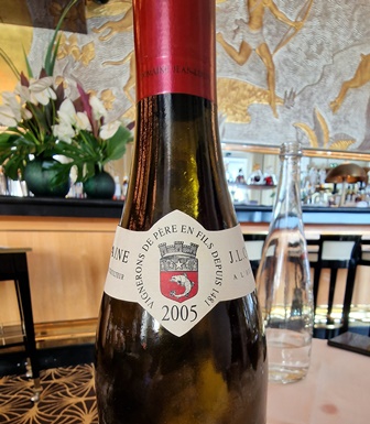 Sur la carte inspirée par Jean Imbert, je choisis un velouté de cèpes et un turbot. Daniel me laisse choisir les vins. Pour l’entrée, ce sera un Champagne Louis Roederer Collection 244 sans année fait de vins de la réserve perpétuelle créée en 2012, de vins de réserve allant de 2012 à 2018 et de vins du millésime 2019. Pour savoir sa composition entre les trois cépages de la Champagne il faudrait aller sur internet. Le sommelier me l’a chuchotée mais je l’ai oubliée. Ce champagne me plait beaucoup dans sa fraicheur et sa droiture. Il est un peu jeune pour mon palais mais tient sa place. Nous l’avons pris au verre.