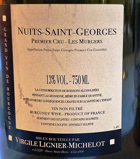 Je jette mon dévolu sur un Nuits-Saint-Georges Premier Cru Les Murgers Lignier-Michelot 2017. Le nez du vin est d’une jeunesse folle. Il va falloir que je m’habitue.