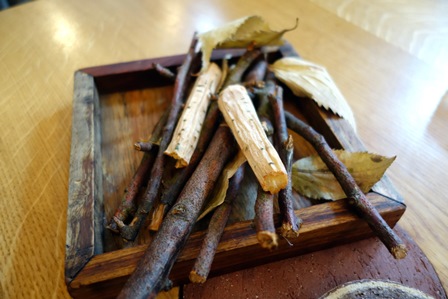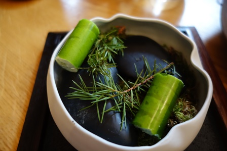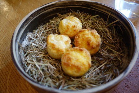 La présentation des salsifis est très forestière, jolie. Le goût est agréable. Je préfère demander un couteau que de partager le pot où nous crémons les salsifis. L’amuse-bouche suivant, toujours d’inspiration forestière et montagnarde est absolument original. L’œuf est fermier, délicieux. L’atmosphère correspond à celle du lieu et c’est un peu des recherches de racines comme la ferme de mon père de Marc Veyrat. La coquille est superbe, bien vivifiée par la truffe. L’oursin a un peu trop de café, le cabillaud est superbe. La seiche me plait beaucoup mais je ne ressens pas la pertinence du consommé de carotte. Les deux points culminants du repas sont l’anguille, plat magistral, qui est dans la même lignée que l’anguille merveilleuse de Christian Le Squer, et la tourte de pigeon plat de cuisine bourgeoise magnifiquement réalisé. Un troisième sommet serait le dessert au lait qui allume des réminiscences enfantines.