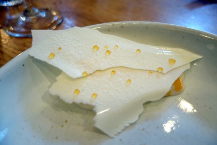 Nous avions envie de prendre le déjeuner à l’eau mais à un moment, l’appel d’un vin est irrésistible sur cette belle cuisine. Un Champagne Version Originale Selosse dégorgé en avril 2015 est exactement ce qu’il faut pour cette cuisine racée. Il est vif, cinglant, tranchant, vineux avec des notes de fruits roses un peu fumées. C’est un grand champagne.