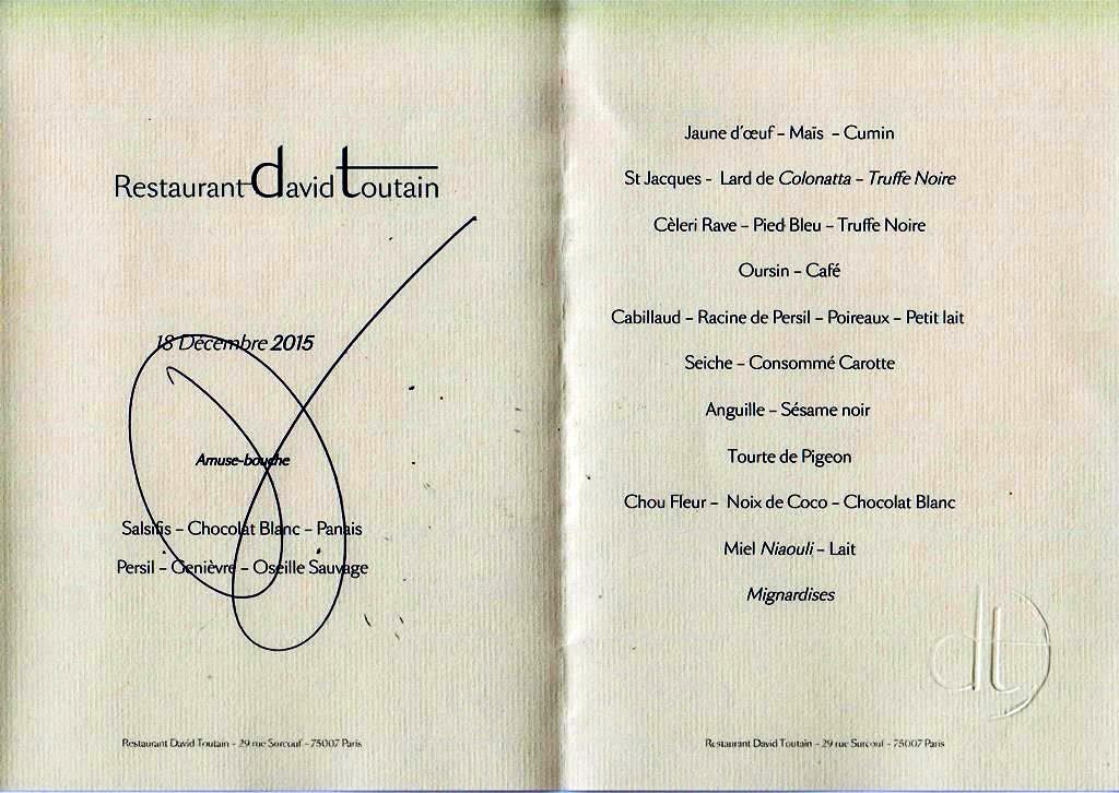Le menu proprement dit est : jaune d’œuf, maïs, cumin / Saint-Jacques, lard de Colonnata, truffe noire / céleri rave, pied bleu, truffe noire / oursin, café / cabillaud, racine de persil, poireaux, petit lait / seiche, consommé carotte / anguille, sésame noir / tourte de pigeon / chou-fleur, noix de coco, chocolat blanc / miel Niaouli, lait / mignardises.