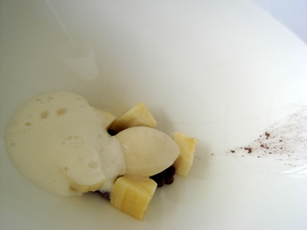 Sur la photo de ce sorbet et dés de banane on peut imaginer la trace de droite sur l’assiette comme l’encre lancée par une seiche troublée.