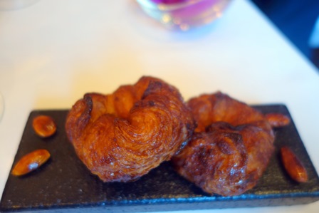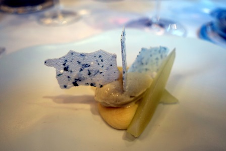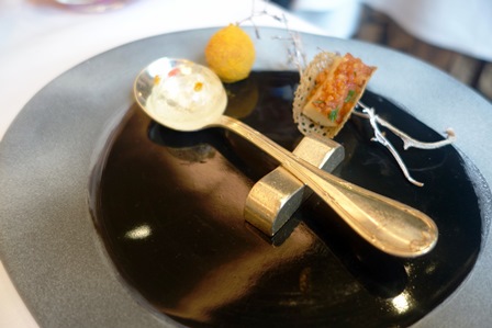 J’ai, par expérience, une grande admiration pour le talent de Christian Le Squer. Je suis donc a priori conquis. La petite gelée fondante d’accueil qui de plus se voit propulsée par le Champagne Comtes de Champagne Taittinger 2006 ne va pas contrarier mes préjugés. Les amuse-bouche sont bons et ne cherchent pas à en imposer et c’est une bonne chose. Thierry le chef sommelier qui nous a versé ce champagne a bien fait car le champagne est pur, précis et en plus il est de belle ampleur en bouche. Il va d’ailleurs se révéler extrêmement gastronomique.