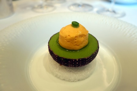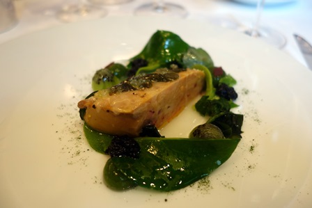 L’avocat et l’oursin se combinent de bien belle façon. Avec le jardin marin et le riz noir, je veux explorer de nouvelles tendances du chef. Le « terre et mer » est une tendance qui perdure et dont je ne suis pas un adepte convaincu. Si cela a bien fonctionné pour l’avocat, je suis plus sur la réserve pour l’entrée. Le foie gras poché est divin et tout ce qui est marin et qui l’entoure ne me convainc pas outre mesure. De plus le caviar est à peine lisible. Le foie gras seul m’eût enthousiasmé.