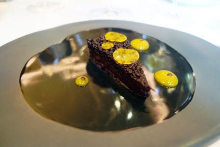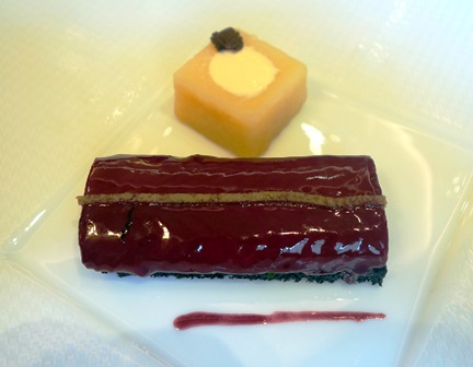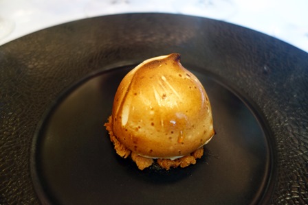 Je ne suis pas très convaincu par l’interprétation qui est faite du roquefort mais j’applaudis à deux mains la merveilleuse omelette norvégienne interprétée de façon originale, d’une exécution digne d’éloges. Il est intéressant de constater qu’il y a des plats d’une réelle perfection où chaque composante semble pesée au trébuchet. Tout est assemblé comme s’il était impossible de concevoir le plat autrement. C’est le cas de la timbale de spaghetti, de l’anguille et de l’omelette norvégienne. Les autres plats semblent être en phase de maturation comme le jardin marin et le riz noir. Mais globalement on se trouve transporté par cette cuisine de très haut niveau. Le cadre est beau, le service est impeccable. Il y a en ce lieu une atmosphère de haute gastronomie.