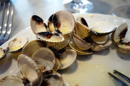 Nous commençons par une coupe de Champagne Laurent-Perrier extra-brut, vif, tranchant, adouci par les délicieuses coques qui sont le signe de bienvenue de ce restaurant. On s’accommode très bien de l’absence de dosage.