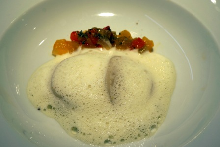 La liste des vins est très limitée. Il y a un seul champagne, le Champagne Louis Roederer Brut sans année. Ce sera notre choix. J’avoue être très circonspect envers ce champagne qui ne m’inspire en rien. C’est très étonnant de la part de cette réputée maison de champagne de ne pas faire un champagne qui colle mieux à la demande actuelle qui est de moins de dosage et de plus de tension.