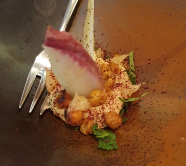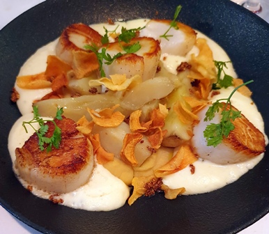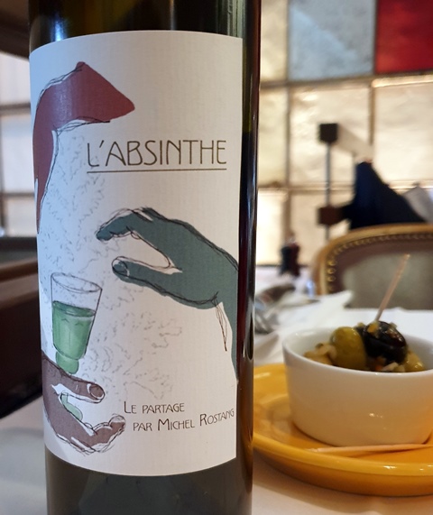 Je vais déjeuner au restaurant l’Absinthe qui se dit « bistrot de cuisiniers », dirigé par Michel Rostang et ses filles. La carte des vins est intelligente et il y a des vins tentateurs. Etant en avance, je prends une bière avec des olives particulièrement bien assaisonnées et gourmandes. Mon menu sera : le Hot Duck, foie gras grillé et parmesan / noix de Saint-Jacques bretonnes rôties, topinambour confit à l’huile d’olive, émulsions racines / dessert à base d’agrumes.
