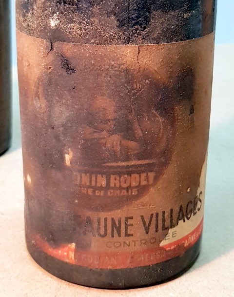 Le vin rouge de 1946 a une étiquette très noircie par le temps. Le vin est d’Antonin Rodet qui n’est pas présenté comme propriétaire, comme domaine ou comme négociant mais avec l’intitulé « Antonin Rodet Maître de Chais ». On lit cette même mention sur le haut de la capsule. Et le vin est un Côtes de Beaune Villages, avec un « S ». Bien sûr il y a l’indication « Antonin Rodet Négociant à Mercurey Saône et Loire », en tout petit en bas de l’étiquette, mais c’est Maître de Chais qui est clairement mis en valeur. Le bouchon se brise mais sans problème et l’odeur qui apparaît est celle d’un vin légèrement torréfié, sans que ce soit particulièrement gênant. J’ouvre maintenant le 1961 qui nous rassemble et le bouchon comme les précédents se brise en trois morceaux sans que cela représente un quelconque problème. Le nez est immédiatement généreux, plein, et annonce un vin riche qui va nous plaire. Je suis assez content qu’il n’y ait aucun problème majeur.