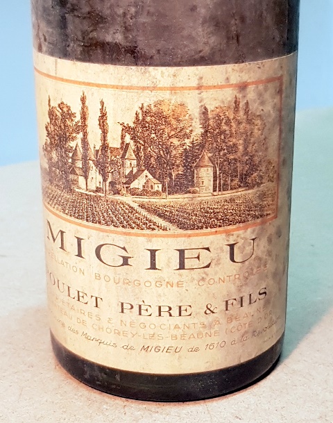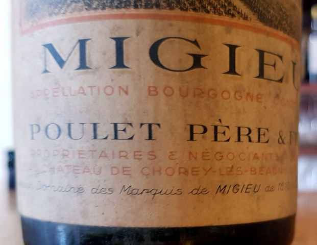 Arrêtons-nous un instant sur l’étiquette. Ce qui est marqué en gros et au centre c’est Migieu en dessous on lit « Appellation Bourgogne Contrôlée ». « Poulet Père & Fils » est annoncé comme « propriétaire et négociant au château de Chorey-lès-Beaune », et l’on voit ensuite en tout petit « ancien domaine des marquis de Migieu de 1610 à la Révolution ». Avais-je déjà vu un vin qui s’appelle « Migieu » ? Jamais. Et mes complices non plus.