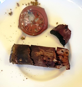 On peut essayer le Côtes de Beaune Villages Antonin Rodet 1946 avec la coquille Saint-Jacques car la truffe intense le permet. Le vin au début montre un peu son caractère torréfié mais très vite il gagne en fluidité. Il est riche, lourd, épais, et s’il n’a pas une palette aromatique très complexe, il se comporte très bien car il est droit et long, avec une belle persistance. Ce n’est pas un grand vin mais c’est un vin qui excite l’intérêt. Il s’est d’ailleurs bien comporté tout au long du repas, la fatigue disparaissant et la légèreté s’affinant.
