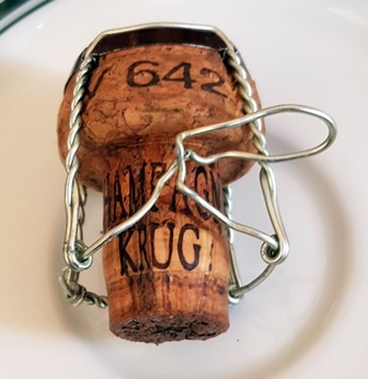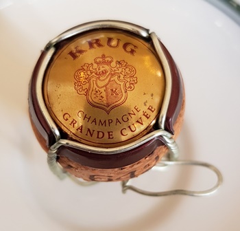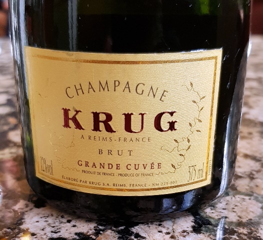 Denis arrive en avance ce qui va nous permettre de bavarder, de quoi ? De vin bien sûr. Il est né en 1985 et s’intéresse au vin. Il lit mon blog avec une assiduité qui me fait plaisir. Il a apporté un vin mais je le dissuade de l’ouvrir puisqu’il y aura suffisamment. Gilles nous rejoint à l’heure du déjeuner. Il est né en 1955 et mes deux compères sont donc de deux années splendides pour les vins. Le plus vieux vin bu par Gilles est de 1945 alors que pour Denis le plus vieux est de son année de naissance, 1985. Il va donc boire trois vins plus vieux que ses parents. J’ai commandé une demi-bouteille de Krug Grande Cuvée d’une dizaine d’année pour servir d’entrée en matière. Le champagne qui a déjà une certaine maturité est glorieux, riche, carré, droit, serein et persuasif. Les trois amuse-bouche sont talentueux. C’est avec le petit toast au poisson que le champagne s’exprime le mieux. Ce Krug est vraiment noble et excellent.