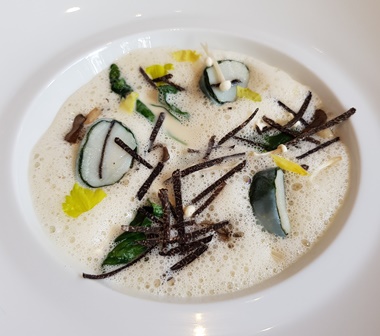 Le menu que nous prenons est le menu de saison : araignée de mer dans ses sucs en gelée, crème de fenouil / coquilles Saint-Jacques truffées cuites à la vapeur, pleurotes, épinards et nage onctueuse au chardonnay / agneau de lait des Pyrénées grilloté aux pignes de pin, pommes de terre à la cendre / soufflé chaud à la noix de coco et citron noir.