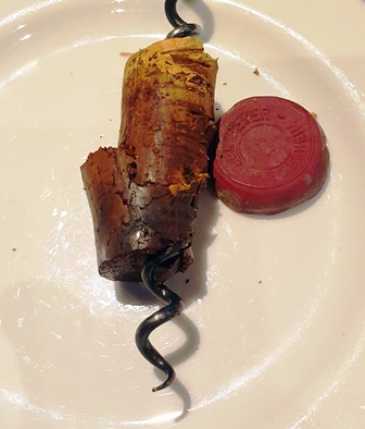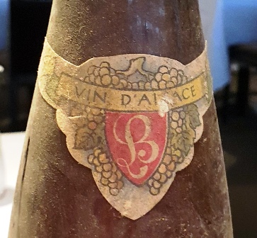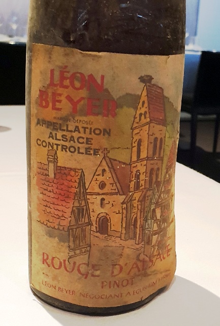 Que choisir en cave ? Son groupe est actif en Champagne et en Bourgogne, il est donc exclu que je choisisse dans ces régions. Comme nous déjeunons, j’élimine les liquoreux peu propices au travail postprandial. Que reste-t-il ? J’arpente des allées en cave et mes yeux se portent sur une bouteille de Vin d’Alsace Léon Beyer qui indique « Rouge d’Alsace » Pinot. La bouteille est assez sale et opaque, avec un verre teinté mais par transparence je vois un liquide clairet qui s’inscrirait plus dans le camp des rosés que celui des vins rouges. Il n’y a pas de millésime mais on peut penser aux années 60 voire un peu avant. Voici une bouteille énigmatique qui conviendrait bien à ce repas.