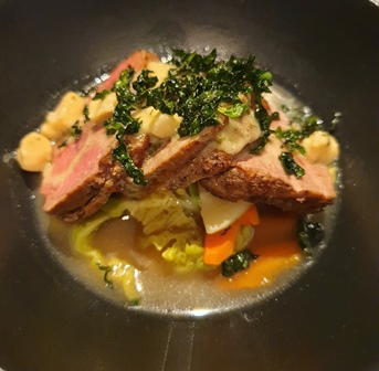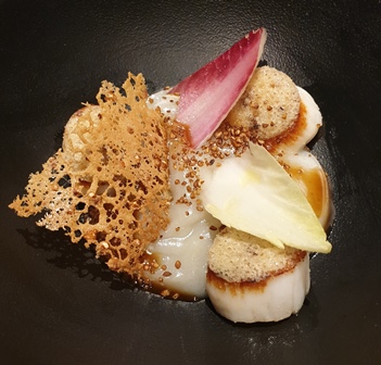 J’arrive en avance et mon hôte avait déjà fait ouvrir une bouteille. Je demande la permission d’ouvrir la mienne et je l’obtiens. Le nez de mon vin est très expressif et engageant. Gilles arrive et nous commandons les mêmes plats : noix de Saint-Jacques de Normandie en fine chapelure de sarrasin, mousseline de topinambour, salade amère, sauce diable au cresson / faux-filet de bœuf Angus rôti, légumes comme un pot-au-feu, vinaigrette moelle-estragon.
